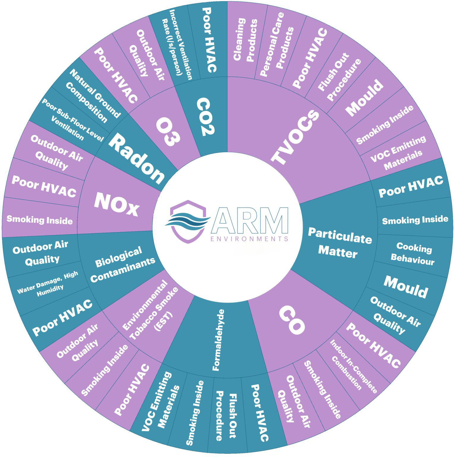 Volatile Organic Compounds (VOCs): gases released from certain solids and liquids, like cleaning products or paints. These are often measured as Total Volatile Organic Compounds (TVOCs) as ‘VOCs’ are composed of various different compounds and it is initially considered too time consuming and expensive to measure for each compound independently. These are individually tested for if an inexplicably high TVOC reading is initially recorded.