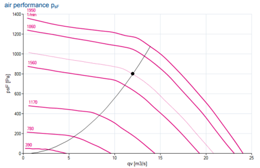 Based on an office application with an air handling unit providing a constant 12m³/s of air to the building for the 1000 occupants (12l/s per person). The IE5 EC plug fans would be consuming approximately 13000 watts based on a total pressure of 800Pa at 12m³/s.